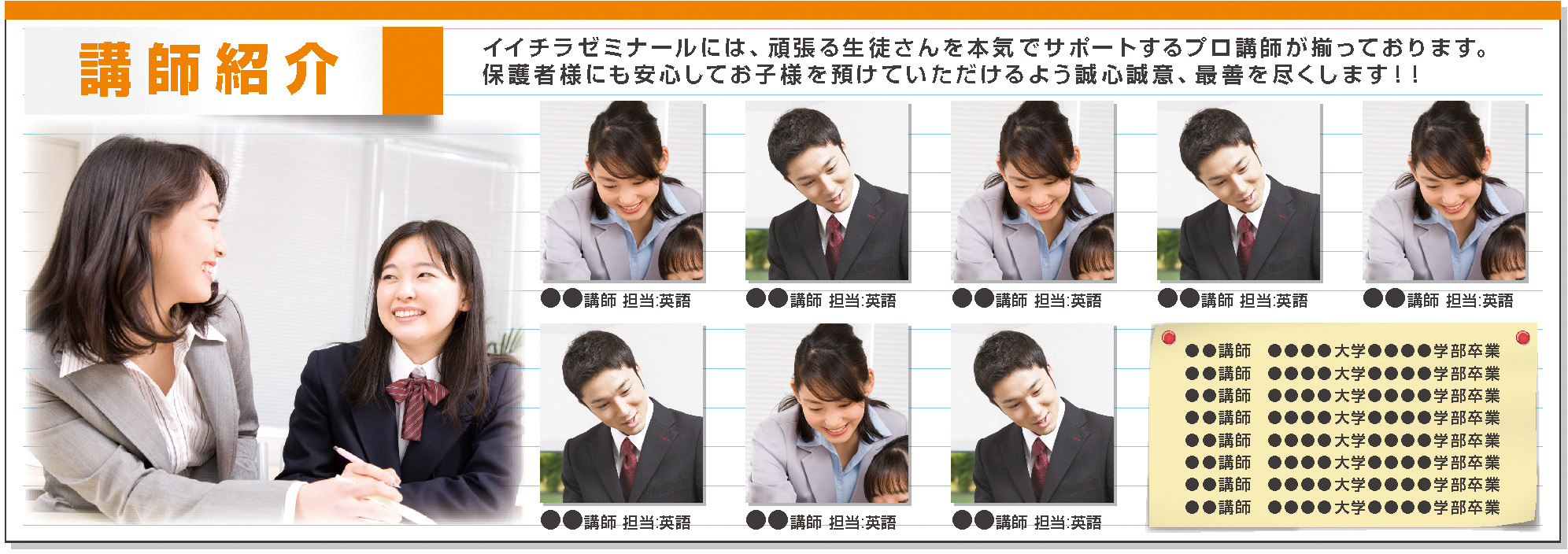 チラシ内の幅257×高さ90mmを自由にデザインいたします。手描きのラフや文字原稿などを基に、作成いたします。上記パーツでは足りない塾の特徴などを盛り込んでみませんか?